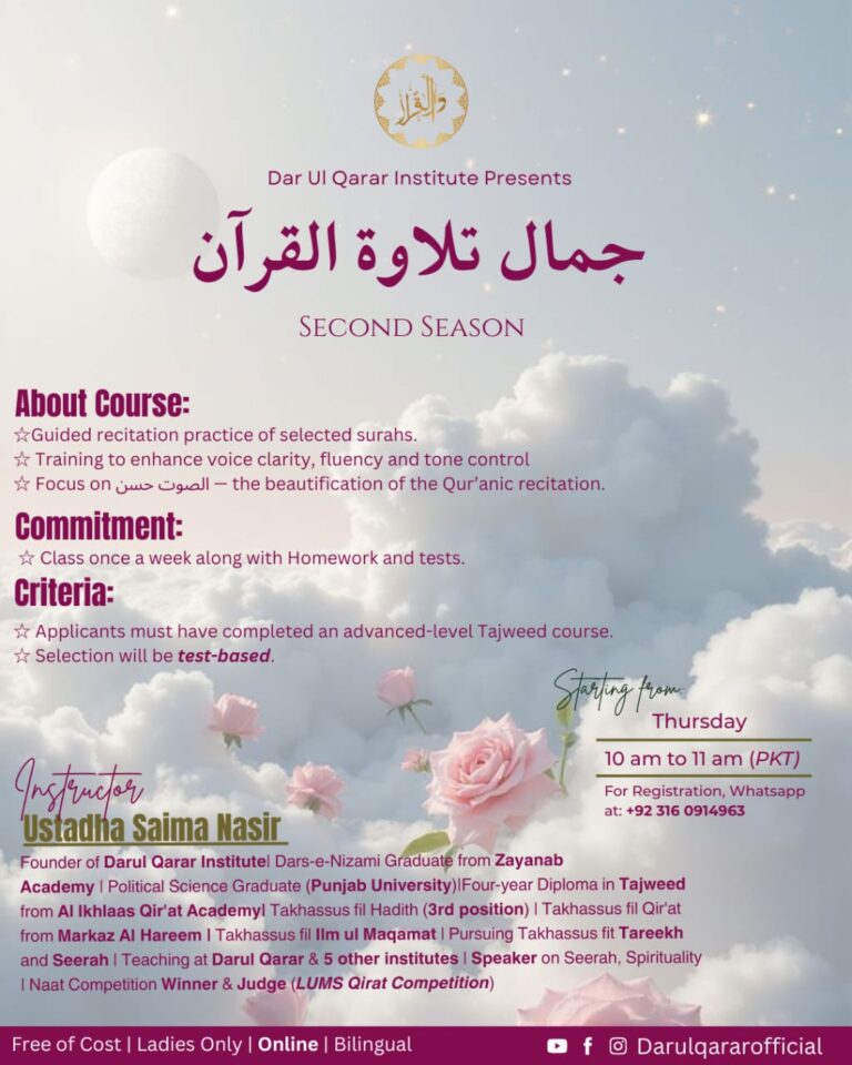 Master your recitation with our flagship Haqq ul Tilawah, Jamal e Tilawah & Nighmat ul Jinnah courses. These live Zoom sessions focus on perfecting Tajweed rules with expert Alimas.